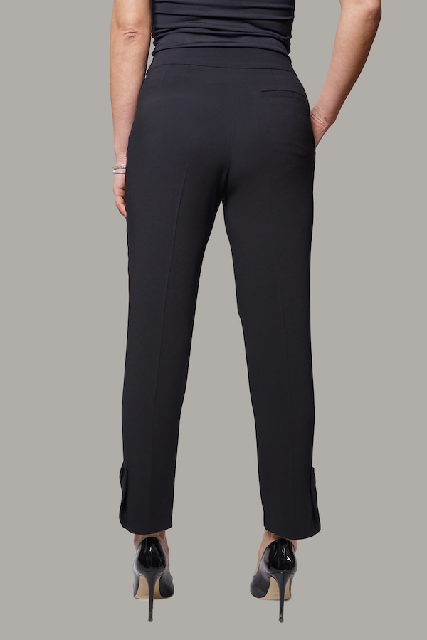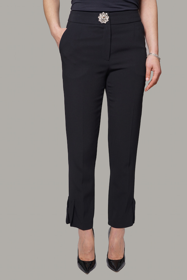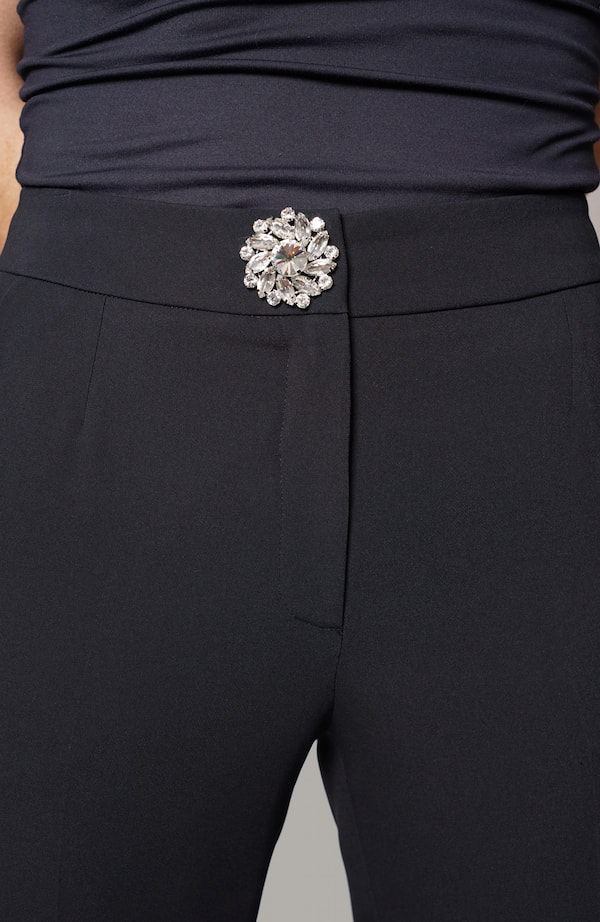 Pantalone a sigaretta in crepe di viscosa stretch, con motivo laterale sul fondo del pantalone, la vita è regolare e presenta una applicazione gioiello, chiusura davanti, tasche alla francese davanti, il dietro presenta una tasca a filetto, vestibilità morbida.
